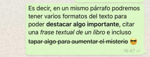 De esta forma tan fácil podemos darle un poco más de «color» a nuestros textos en WhatsApp. Recuerda que todo se puede aplicar en un mismo párrafo y tendríamos algo parecido a lo siguiente: